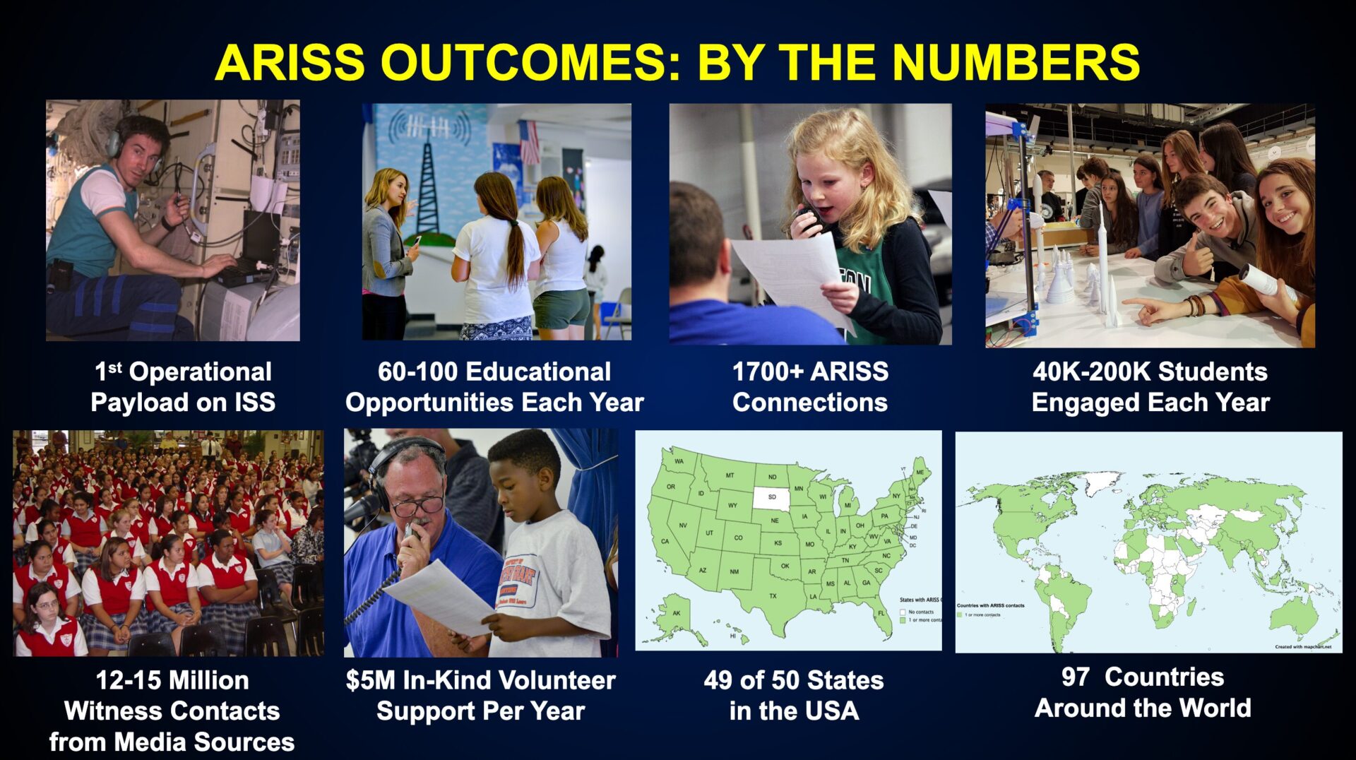 - For information on upcoming scheduled contacts, including possible opportunities to listen in on the contact with schools and educational organizations: Upcoming Contacts and ARISS YouTube page, arisslive