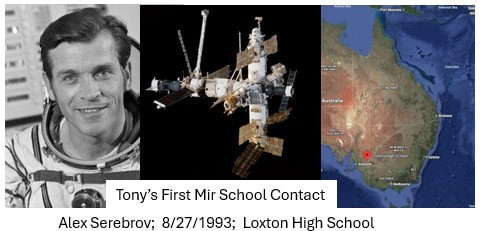 Well it was probably my relationship with Alex Serebrov and the time when I did my first school contact with him for a science class at Loxton High School on August 27, 1993. I teed it up with Alex, and Alex said he was doing it in memory of “my dear friend” Christa McAuliffe [killed in the Space Shuttle Challenger explosion in 1986].